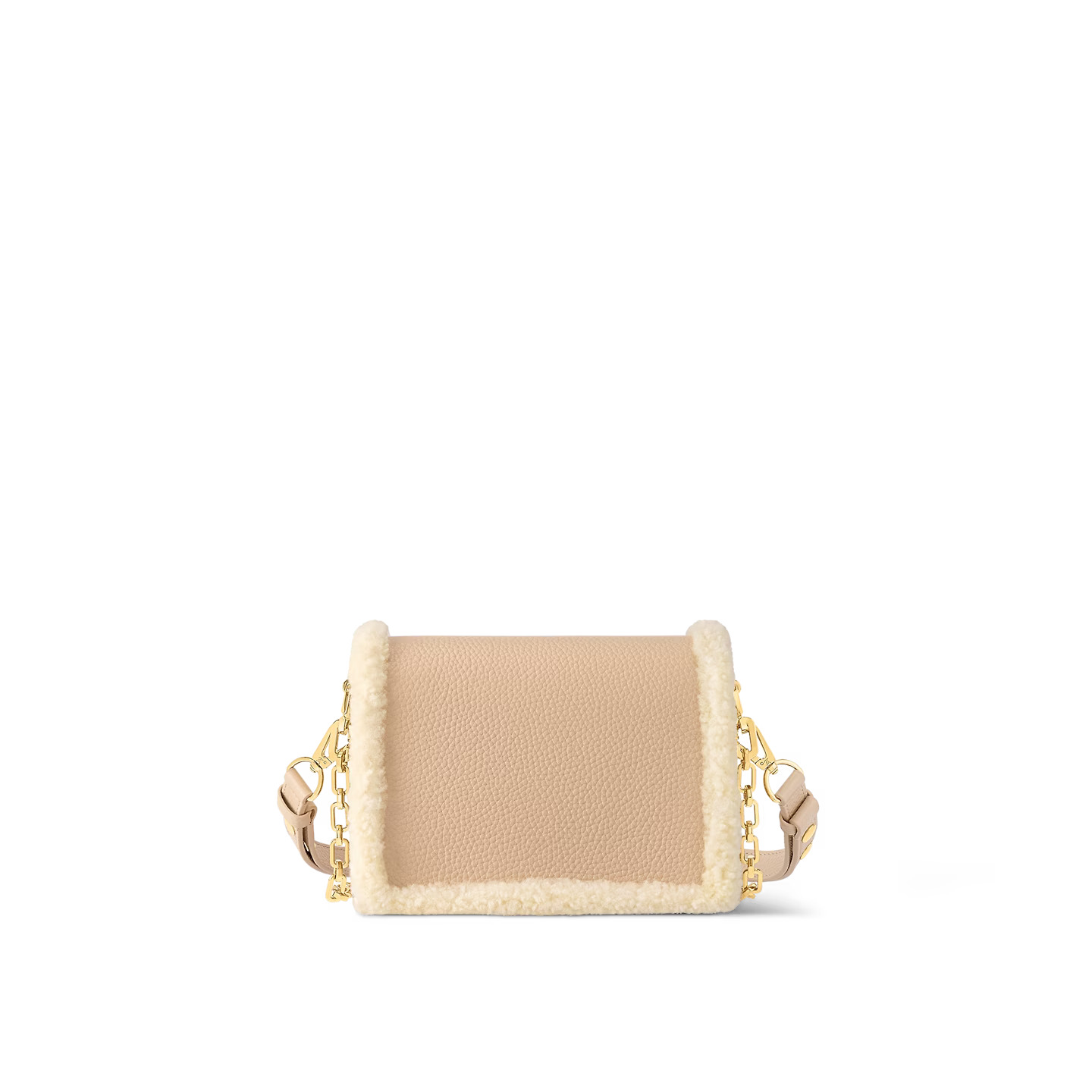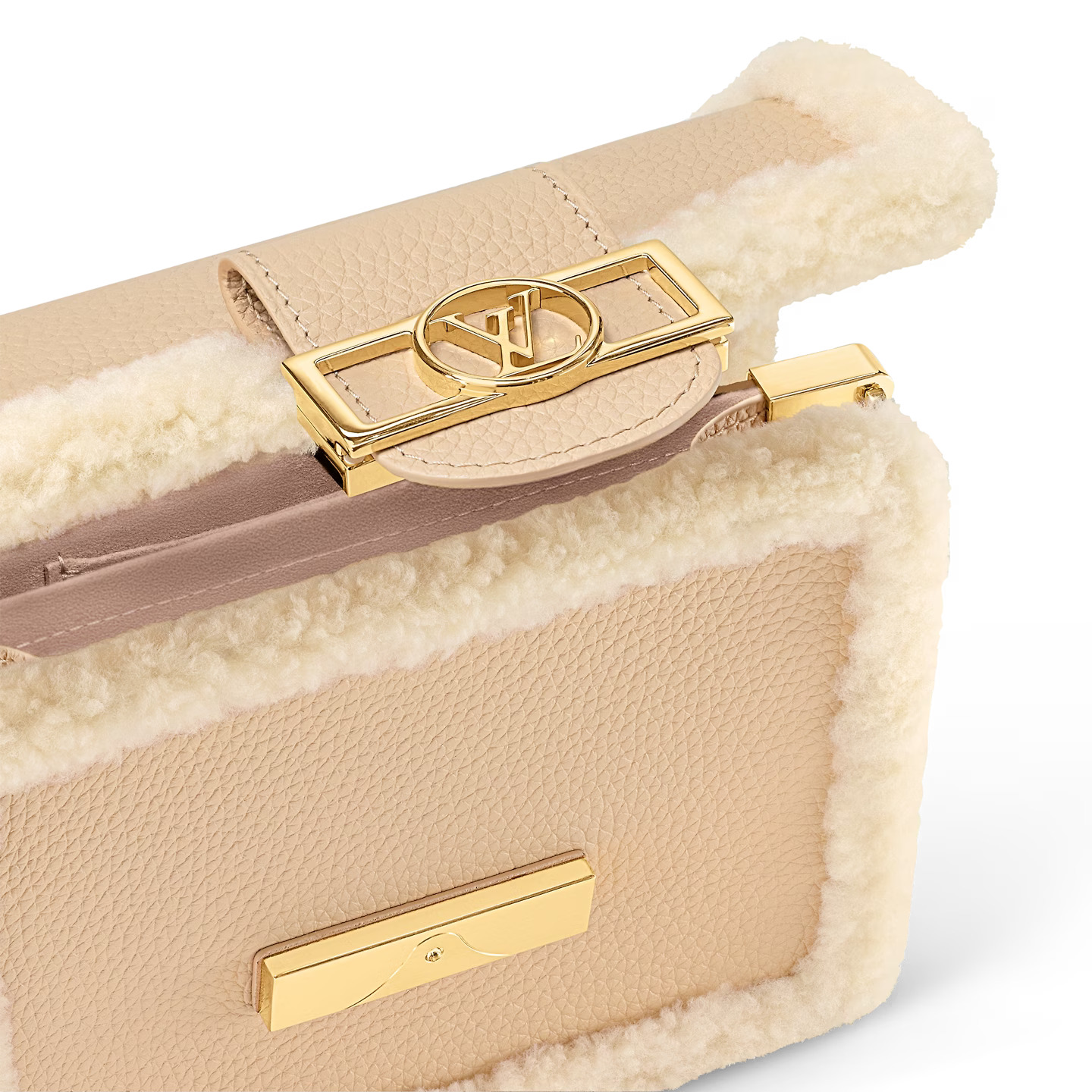 The Mini Dauphine handbag is made from shearling with soft edges. The detachable chain, and removable and adjustable leather strap, enable a variety of carry options.