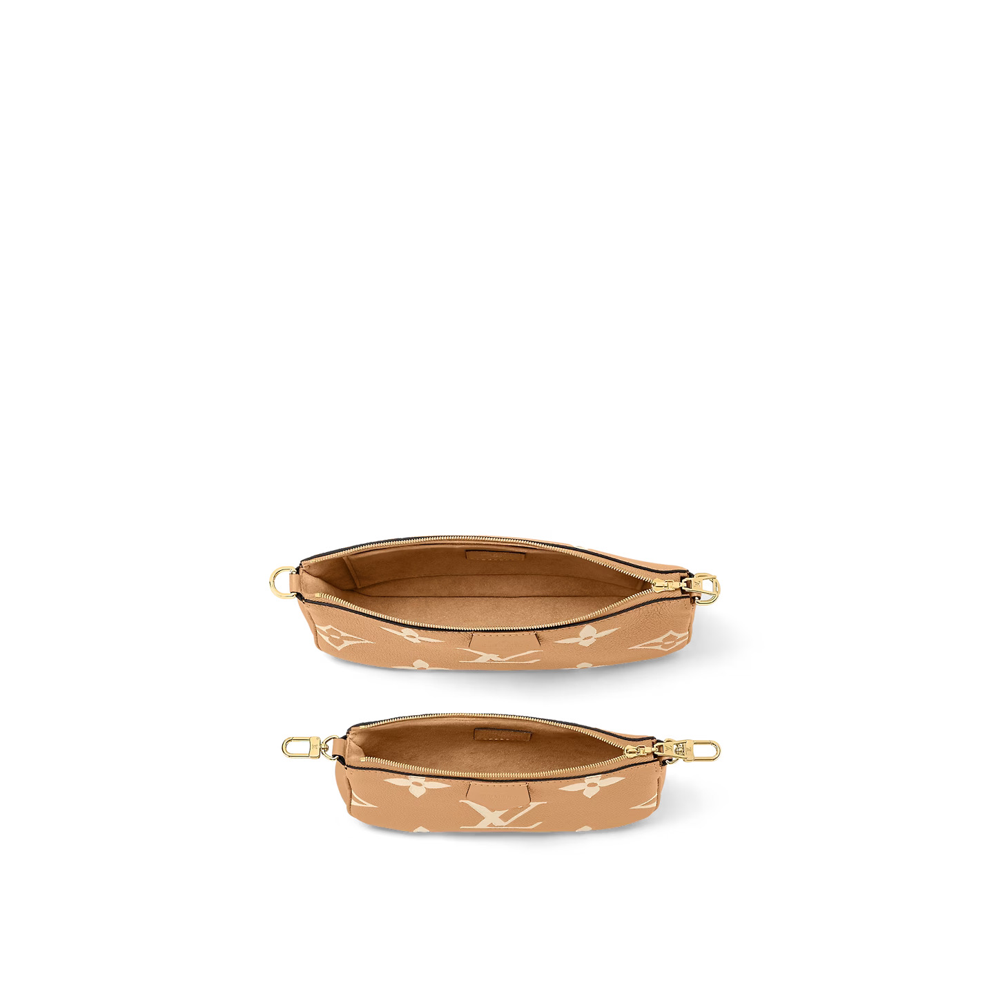 The Multi Pochette Accessoires cross-body bag is fashioned from Monogram Empreinte leather with a warm bicolor colorway that brings out the Monogram Flowers and Louis Vuitton Initials embossed and printed on the cowhide. This hybrid bag combines a Pochette Accessoires with a removable Mini Pochette Accessoires. There’s a detachable gold-color chain with leather braiding and a removeable shoulder strap.