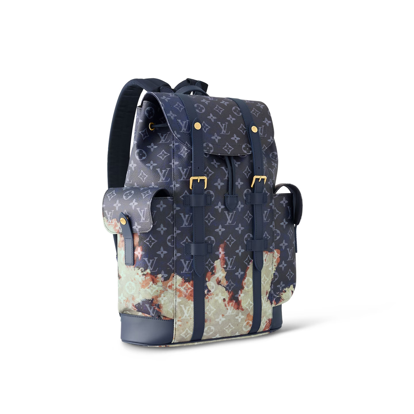 For Spring-Summer 2024, the Christopher backpack takes on a new look inspired by the edgy modernity of bleached denim. Deep blue Monogram canvas is combined with lighter shades in a pattern that evokes the contours of paper burned in a campfire. Both stylish and functional, it features an array of compartments including a special iPad pocket.