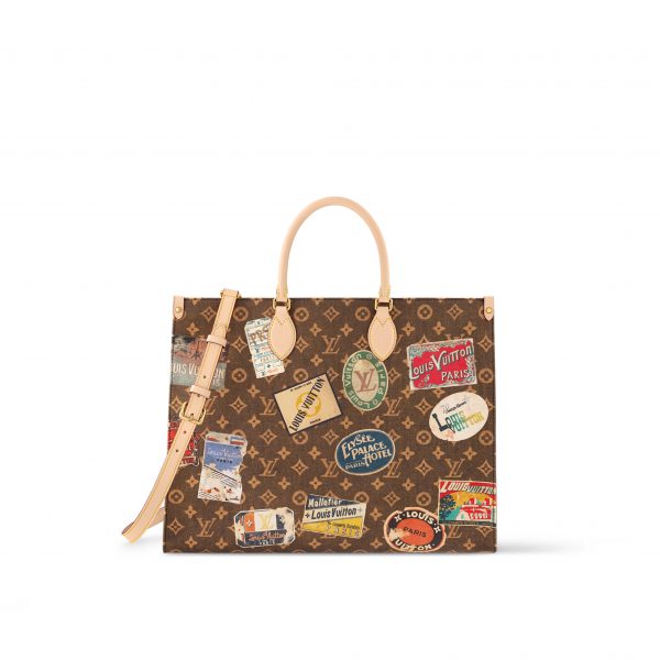 Inspired by archival Monogram canvas, embellished with a patchwork of vintage hotel labels and trimmed with the Maison’s heritage natural cowhide-leather, the season’s new OnTheGo Voyage tote is an ideal addition to the traveling woman’s wardrobe. Fitted with signature Toron top handles and a removable leather strap, this timeless carryall offers maximum versatility.