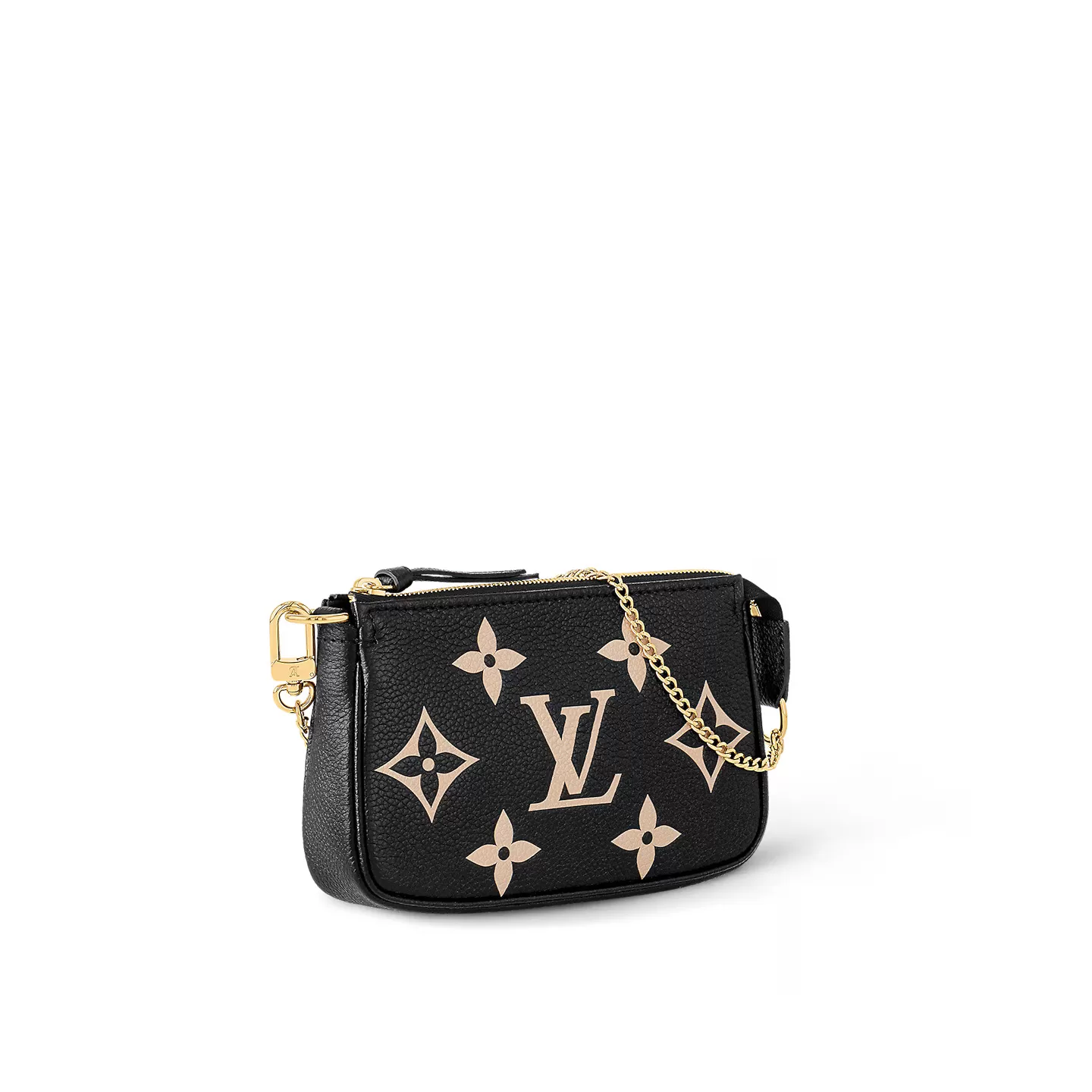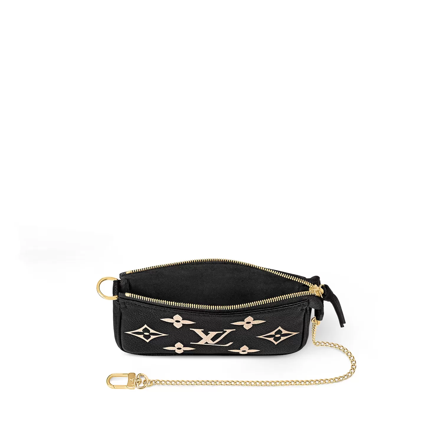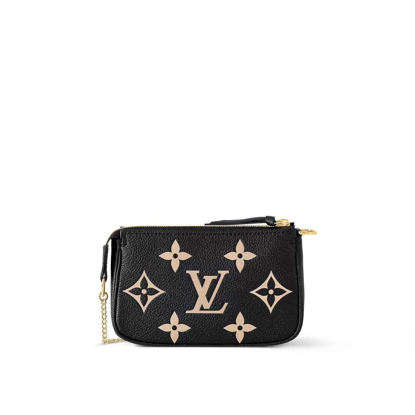 The Mini Pochette Accessoires wears an air of timeless chic in this two-tone edition, crafted from Monogram Empreinte leather embossed with a contrasting Monogram Medium motif. Accented with a golden chain and gleaming hardware, this elegant little pouch can be carried on its own, or attached to a larger bag.
