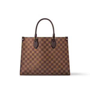 The classic OnTheGo MM handbag is reimagined for the season in Damier Ebene canvas, trimmed with smooth cowhide leather. Accented with gold-toned hardware, it can be hand-carried by the top handles, or styled as a shoulder bag thanks to the longer handles. The sophisticated design is fitted with one interior pocket, and is generously sized to store a laptop as well as other daily essentials.