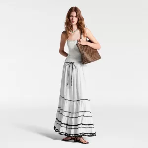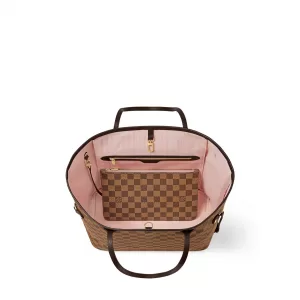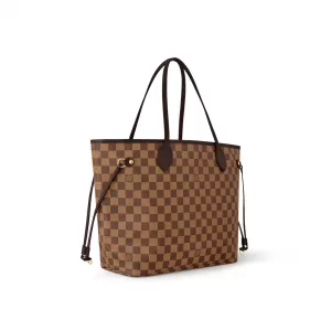 The Neverfull MM tote unites timeless design with heritage details. Elegant in Damier Ebene canvas with natural cowhide trim, it is roomy but not bulky, with side laces that cinch for a sleek allure or loosen for a casual look. Slim, comfortable handles slip easily over the shoulder or arm. Lined in colorful textile, it features a removable pouch which can be used as a clutch or an extra pocket.